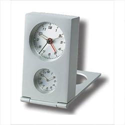 Chass Home and Away Travel Alarm with Pouch Clock. This Chass clock features a flip cover stand. Matte Silver Finish. Size: 1¾ X ¾ X 3" H. Weight: 6 oz.